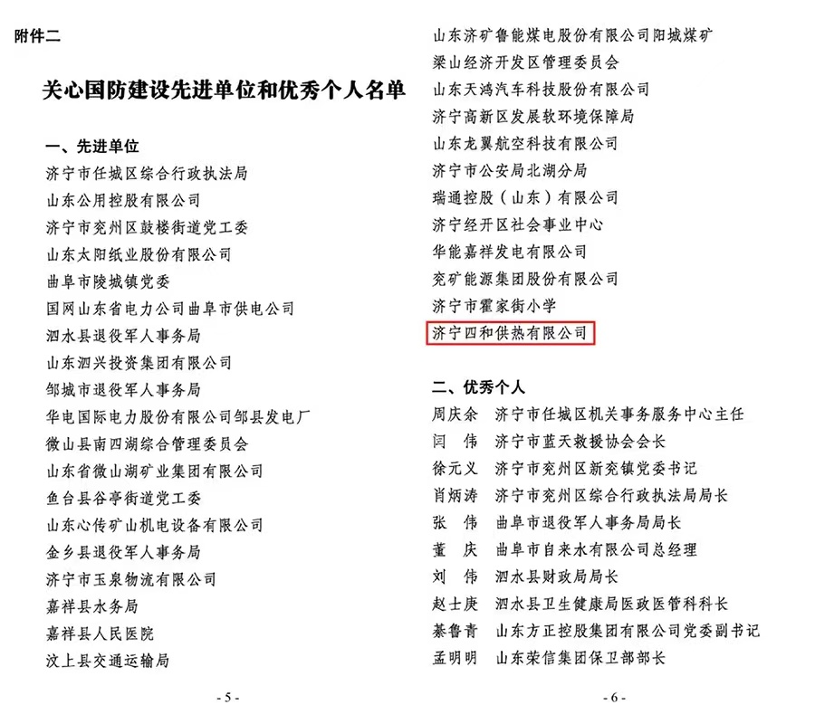 近日,中共濟寧市委辦公室下發(fā)了《關(guān)心國防建設(shè)先進(jìn)單位和優(yōu)秀個人名單》,濟寧四和供熱有限公司榮獲關(guān)心國防建設(shè)先進(jìn)單位榮譽稱號。